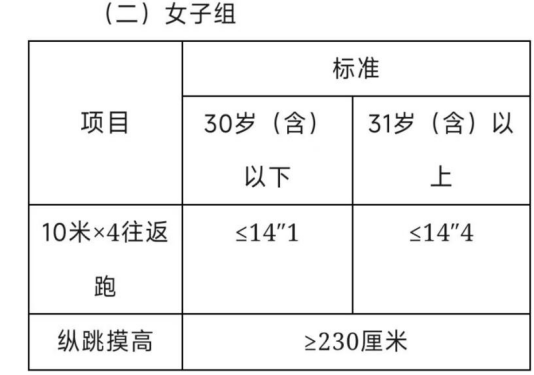 备注:10米×4往返跑每人最多可测2次,1次测评达标即视为该项目测评合格;纵跳摸高每人最多可测3次,1次测试达标即视为该项目测试合格。其中一项体能测评不合格的,取消进入下一环节资格。