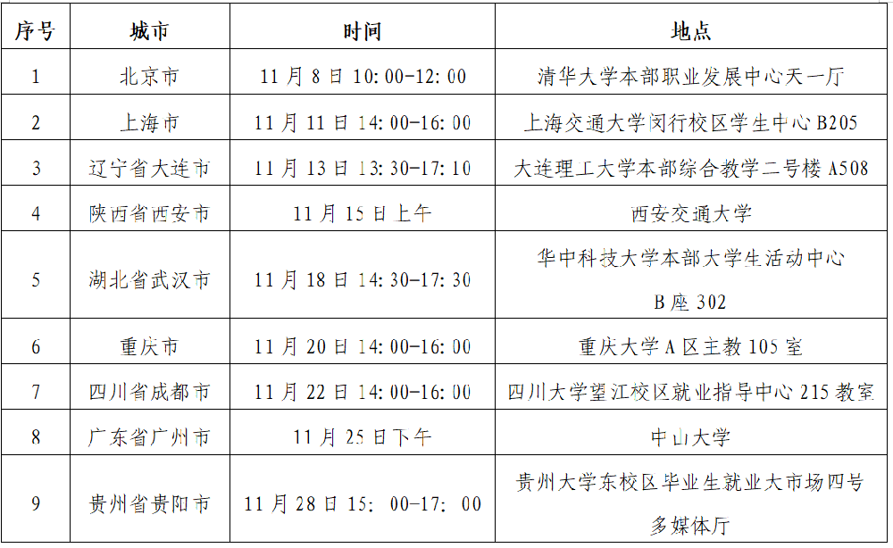 应聘者本人携带个人简历前往宣讲会现场报名。校园宣讲会行程如下: